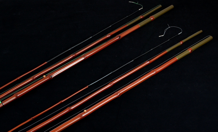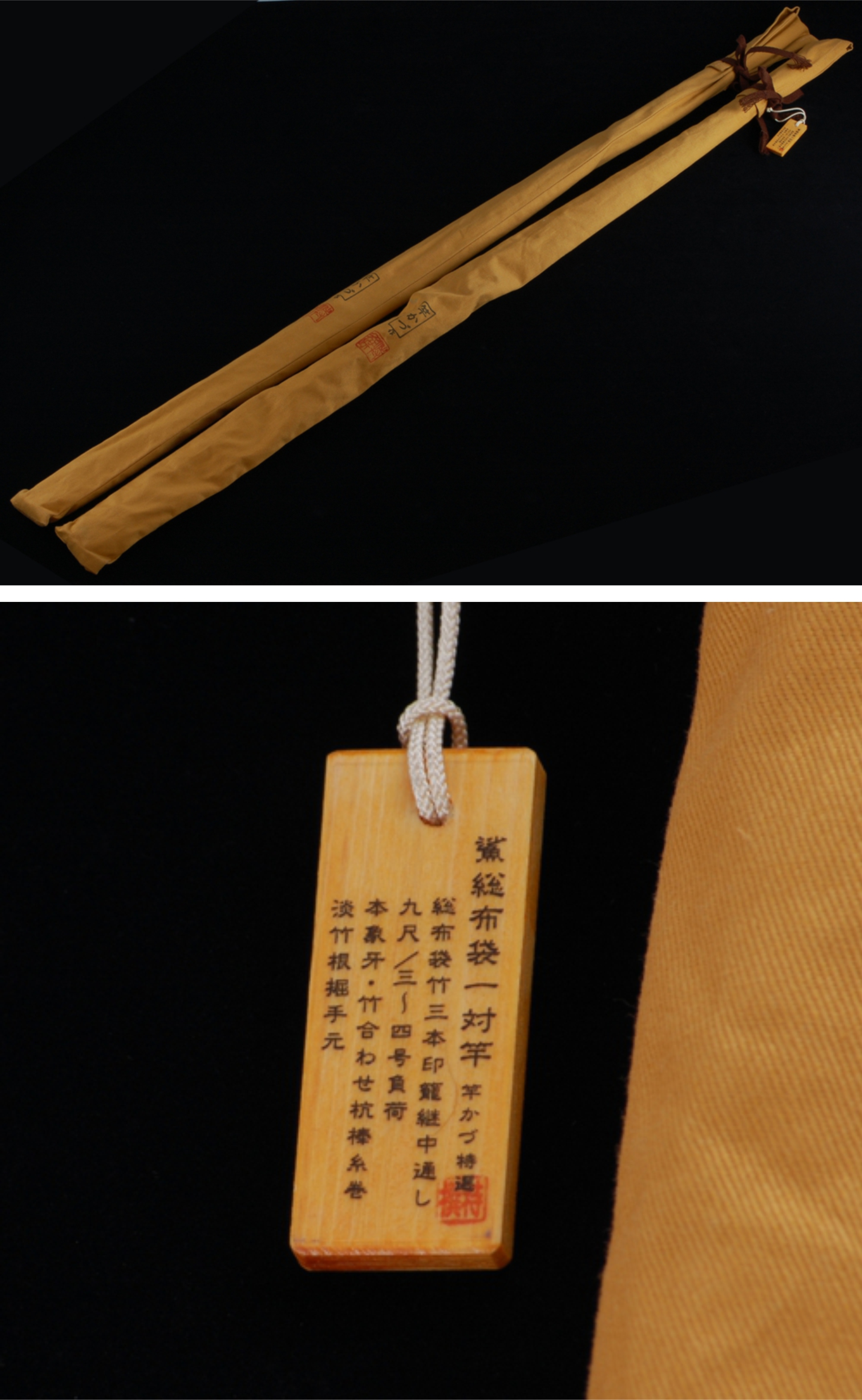 希少な総布袋竹の一対竿が入荷しました。特選にふさわしい良質な布袋竹を組み合わせ、手元には丸みのある根堀の淡竹を取り付けてバランスよく仕上げてあります。使用感の少ない大変程度の良い中古品です。