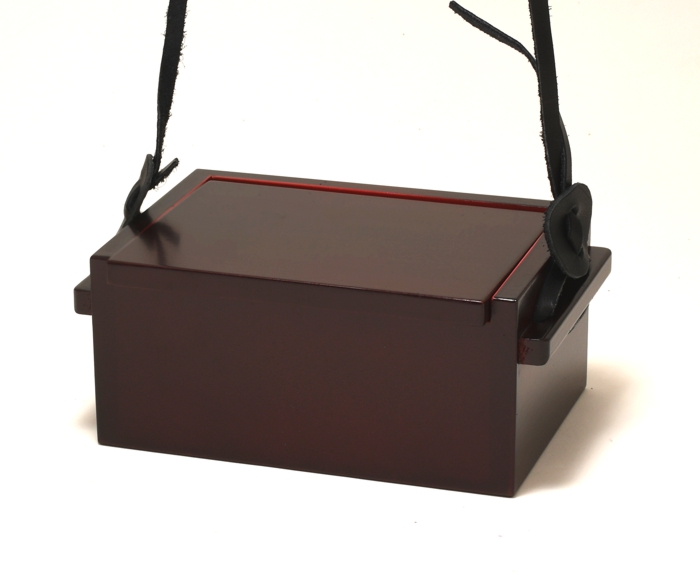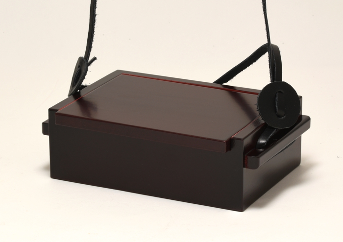 木目の細かい欅を全面に使用して製作したオリジナルの合切箱です。要所に硬質な黒檀を使用し、デザインと実用性を兼ね備えました。本製品の最大の特徴は、道具入れが引き出し式の上部と深さのある下部に分かれており、重箱のように重ねて携行できるように作られていること。蝶番を使わずに製作した堅牢な合切箱です。