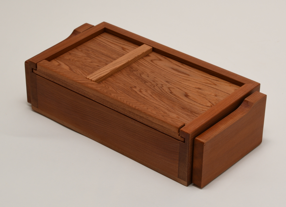 希少な屋久杉を使って誂えた餌箱兼道具箱です。左右で深さの異なる升目を備えた中籠は、小物とエサの分別収納など、アイディア次第で様々な使い方が可能です。