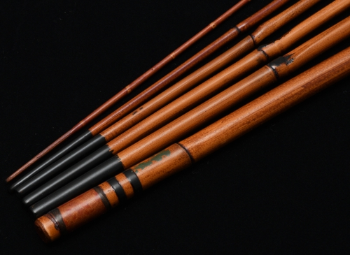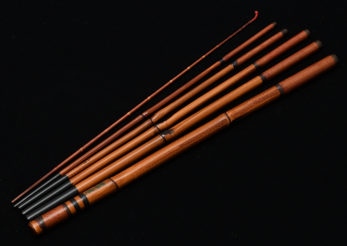 六寸仕舞のタナゴ竿です。金粉を透かし込んだ赤系の口塗りに濃いめの胴漆を合わせました。卵柄塗りで誂えた専用のケースが付属します。