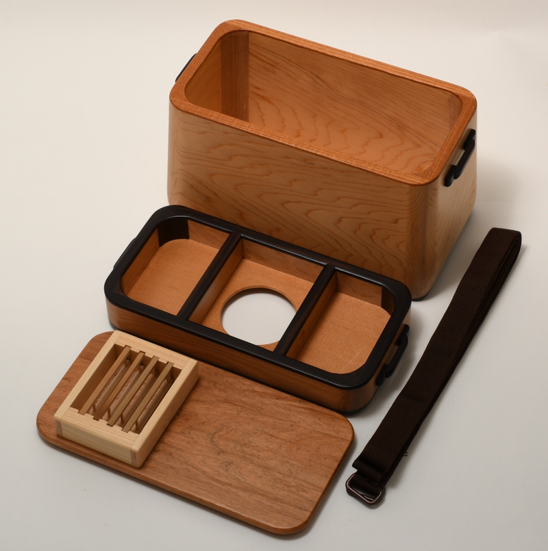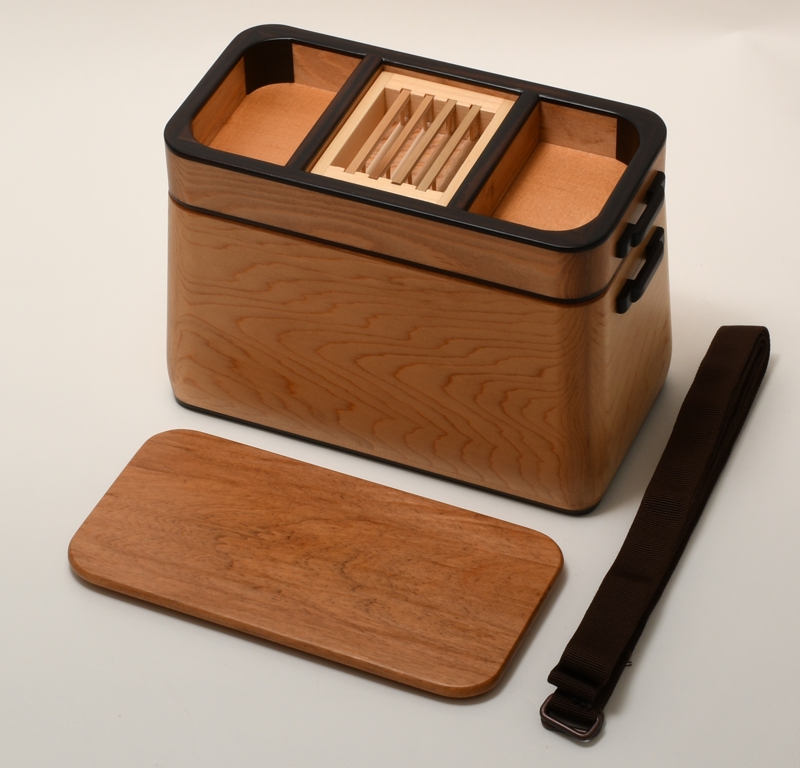 銘木で誂えた箱ビクです。籠ビクをモチーフとした台形の形状で安定感があります。取り外し式の上蓋は、実釣時に箱底面とストラップの間に挟み込んでおけば、歩きながらの釣りでも落下しない仕組みになっています。取り外し式の仕掛け収納も上段のトレーに内臓。タナゴ釣りや小鮒釣りに最適なサイズ感の箱ビクです。真田紐で誂えたストラップが付属します。