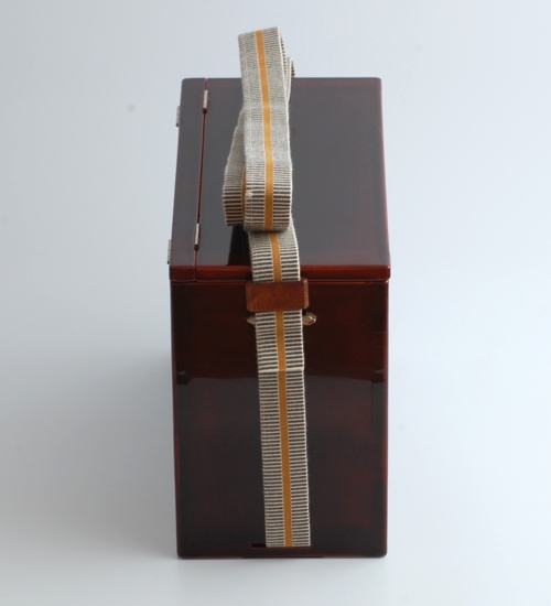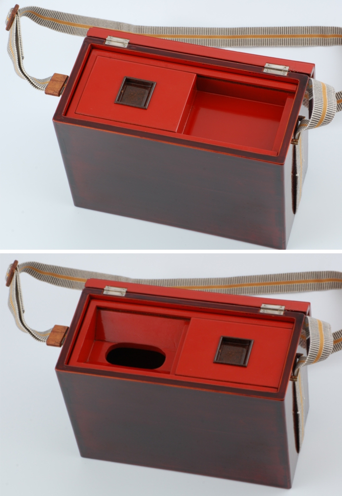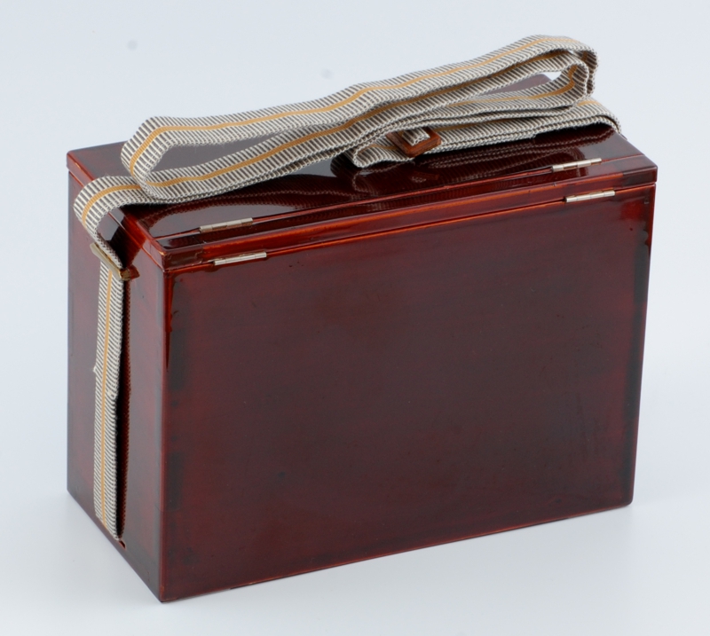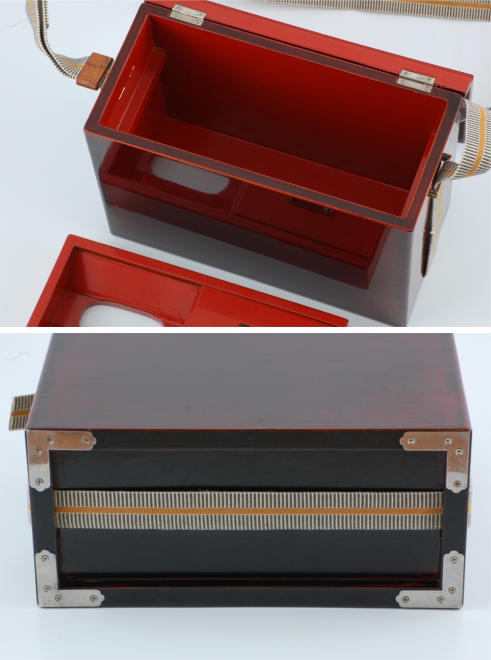 溜塗りが施された8寸の水箱です。光沢のある仕上がりのため保存時にできたと思われる若干のスレ等は見られますが、使用感がほぼなく、大変状態の良い商品です。真田紐で誂えた専用のストラップが付属します。