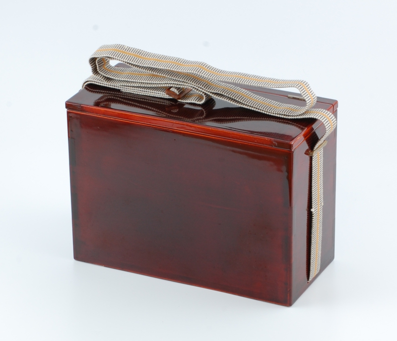 溜塗りが施された8寸の水箱です。光沢のある仕上がりのため保存時にできたと思われる若干のスレ等は見られますが、使用感がほぼなく、大変状態の良い商品です。真田紐で誂えた専用のストラップが付属します。