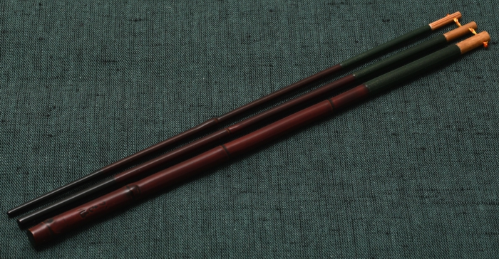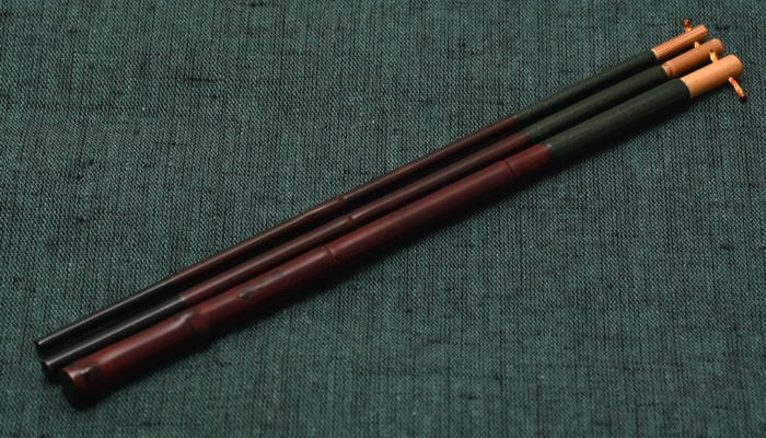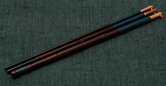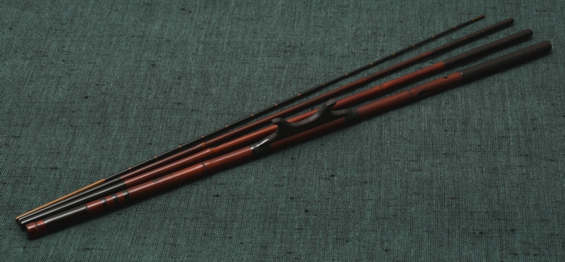 六寸仕舞のタナゴ竿です。金粉を透かし込んだ赤系の口塗りに濃いめの胴漆を合わせました。卵柄塗りで誂えた専用のケースが付属します。