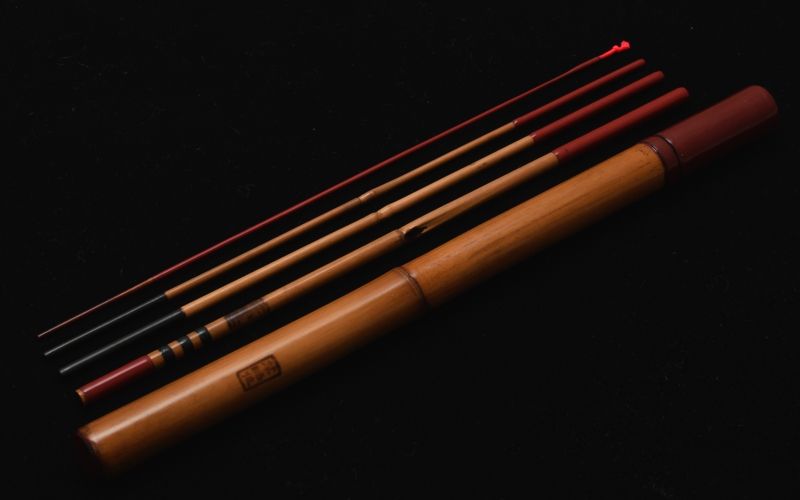 節の詰まった矢竹を主材として製作したタナゴ竿です。細身の素材を選び、しなやかな調子を生み出しています。卵柄塗りの専用ケース付きです。