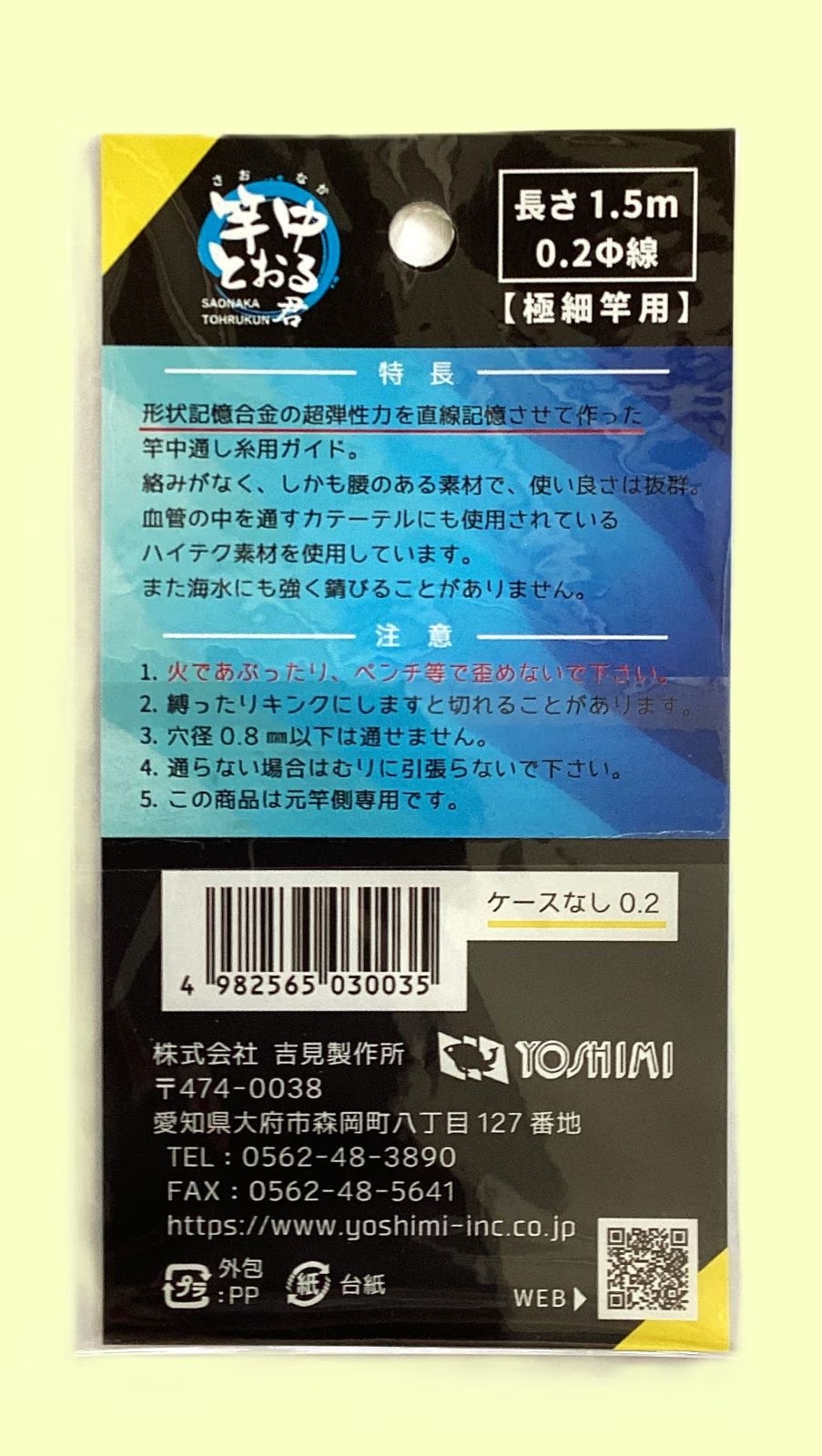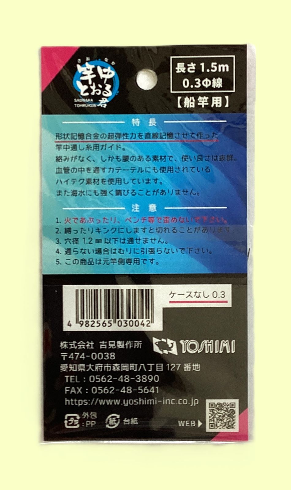 形状記憶合金の超弾性力を直線記憶させて作った中通し竿専用の糸通しワイヤーです。絡みがなく、しかも腰のある素材で、使いやすさ抜群。欠陥の中を通すカテーテルにも使用されているハイテク素材を使用しています。また、海水にも強く錆びることがありません。