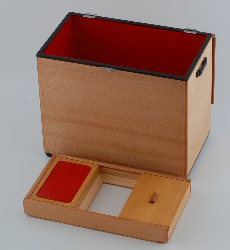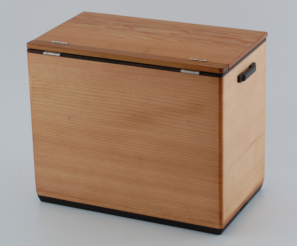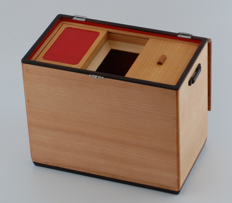木目の細かい上質な榧(かや)を主材とした真鮒の水箱です。要所に黒檀を使い、強度と実用性に配慮しました。上蓋には屋久杉を使用しています。