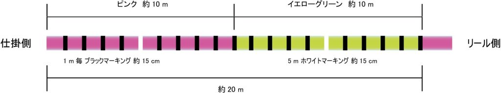 ワカサギ用ですが、糸グセ、ヨレがかかりにくく、取れやすいことからタナゴ釣りでも評価が高いラインです。視認性に優れたピンクとイエローグリーンが10m毎に色付けされています。