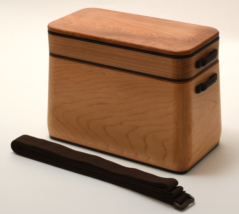 銘木で誂えた箱ビクです。籠ビクをモチーフとした台形の形状で安定感があります。取り外し式の上蓋は、実釣時に箱底面とストラップの間に挟み込んでおけば、歩きながらの釣りでも落下しない仕組みになっています。取り外し式の仕掛け収納も上段のトレーに内臓。タナゴ釣りや小鮒釣りに最適なサイズ感の箱ビクです。真田紐で誂えたストラップが付属します。