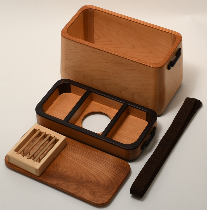 素材: 本体 / 檜、黒檀 上蓋 / 屋久杉 外寸: W20×D11×H15cm 内寸: W17.5×D8.2×H10.3cm 上段トレー左右枡目内寸: W5×D8×H2.2cm 自重: 500g 真田紐ストラップ付属