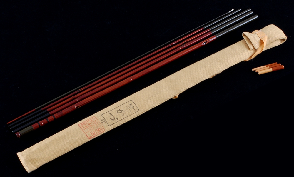 竿かづの小鮒竿の新古品です。特選にふさわしい細身かつ良質な素材を厳選し、極めてしなやかな調子に仕上げています。元竿は矢竹の根堀元、口巻きは定番の単色塗りです。