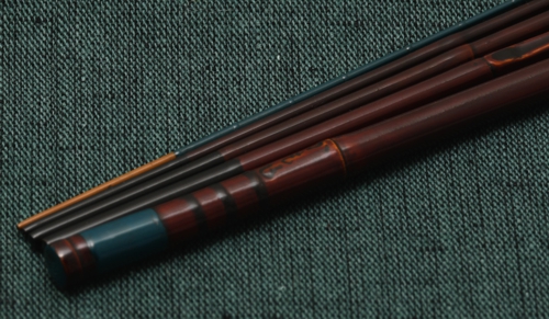 特注の極細グラス素材と矢竹を適宜組み合わせて製作したタナゴの合成竿です。仕上げの本漆や揃い節等、和竿の作りはそのままに、グラスの利点を取り入れることで短竿でありながら掛ければしっかりと曲がる調子を実現しました。グラスの穂持ちは竹素材を上回る十分な強度と柔軟性を持ち、不意の外道に対しても安心してご使用いただけます。和竿そのものの使用感と素材の組み合わせが生み出す釣り味を是非お楽しみください。