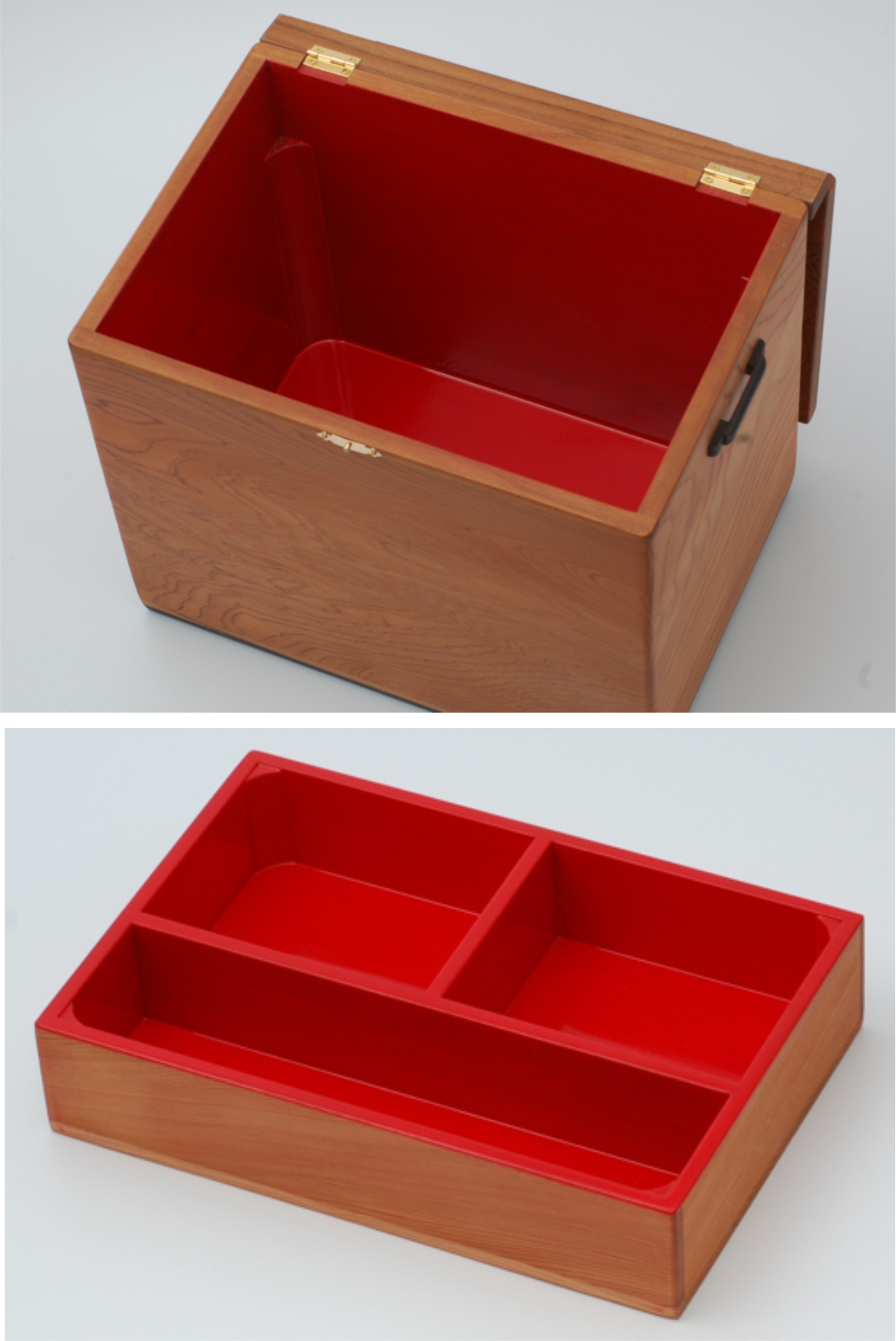 素材: 屋久杉、黒檀本体外寸(内寸): W270 (250) ×D190 (165)×H235 (205)mm ※()は内寸 中籠外寸: W250×D165×H52mm中籠内寸: 升目長W235×W55×H46mm, 升目角 W115×D92×H46mm自重: 約1750g真田紐ストラップ付属